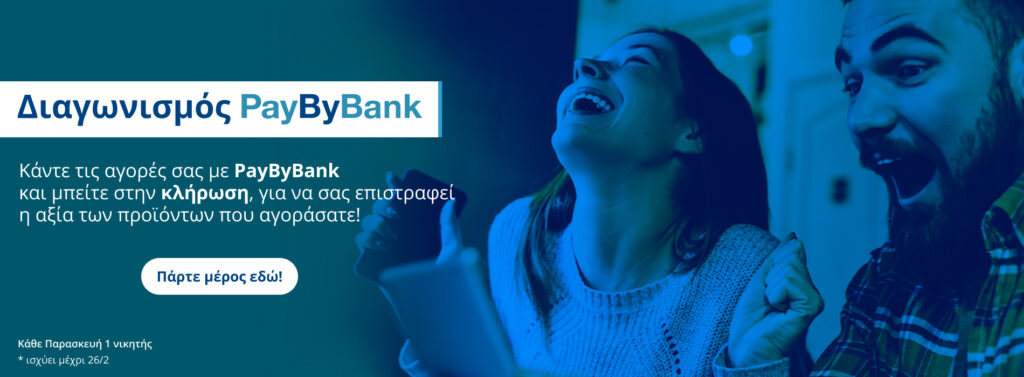 Mε το νέο Διαγωνισμό που τρέχει από 8 Φεβρουαρίου μέχρι και 26 Φεβρουαρίου, όλοι όσοι πραγματοποιούν online αγορές στα συνεργαζόμενα PayByBank eshops και επιλέγουν να πληρώσουν με PayByBank μπορούν να πάρουν μέρος διαγωνισμό.